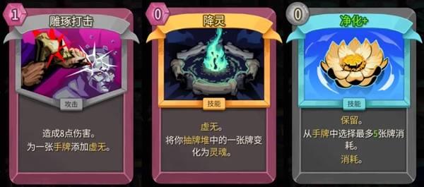 除了核心的回能和过牌卡以外,【雕琢打击】和【降灵】也是很值得拿的,它们就类似战士的【坚毅】【燃烧契约】之类的“消耗”牌,能够让我们在单场战斗内精简牌组,帮我们更好地达成无限。