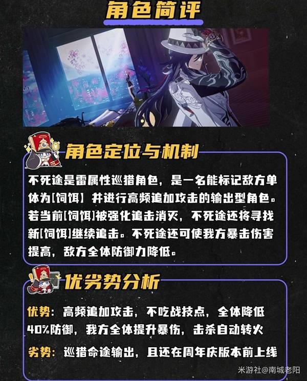 不死途是雷属性巡猎角色,属于高频追击攻击且有转火能力的输出。