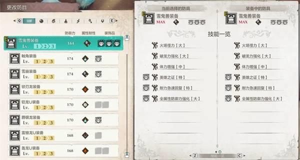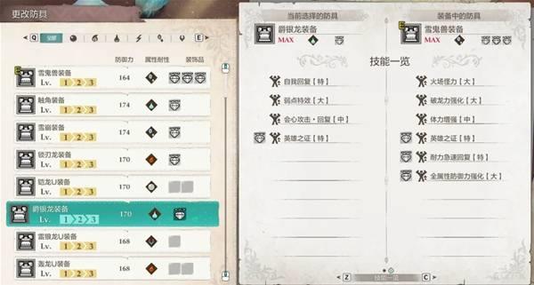 防御力不俗,抗性优秀,这游戏火属性的敌人没哪个强的,也就打溟波龙需要换一套。它自带火场怪力、破龙力强化和体力增强,三个技能都挺实用的,还有三个饰品位,上英雄之证 耐力急速回复 全属性防御力强化基本上就是万金油套装,是我心中泛用性最广的NO.1套装。