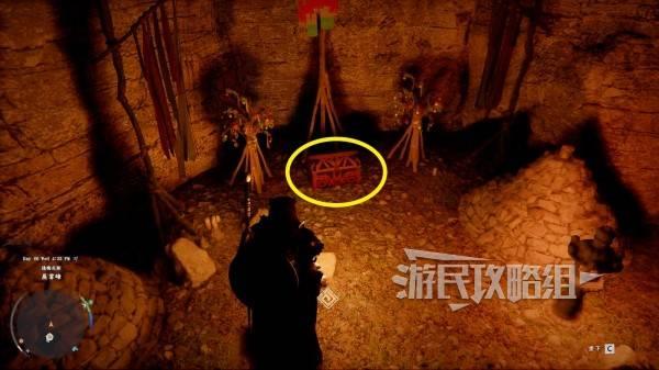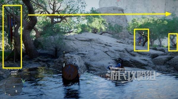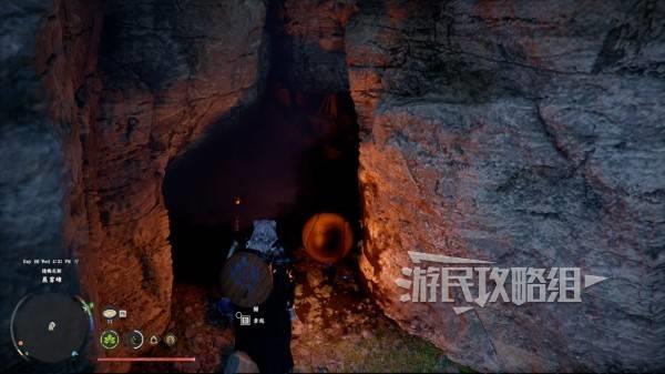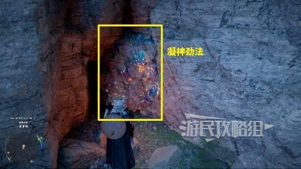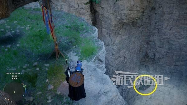 站在悬崖边的最后一个彩带所在位置,往悬崖左下方看,可以看到一个深色的石头平台,飞到平台处。使用凝神劲法打碎挡住洞口的石头(按住L3 R3进入凝神状态后再按R3/键盘X键 鼠标中键),进入洞窟后打开宝箱即可获得。