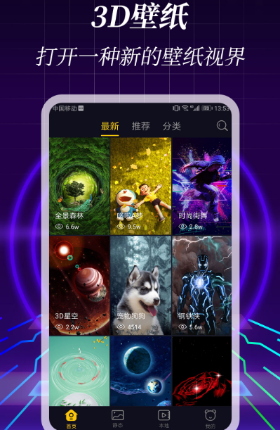 每当看到别人手机当中的动态壁纸,都认为特别炫酷,这些动态壁纸拥有立体效果,给人一种风景如画的感觉,尤其是3D逼真效果,仿佛置身其中一般。不用羡慕他人,我们可以下载动态壁纸满足所有想象。该软件每天都会实时更新,其中有很多风格,包括风景、萌宠、科技、动漫等等炫酷壁纸,每天实时更新,让手机桌面变得更加个性。