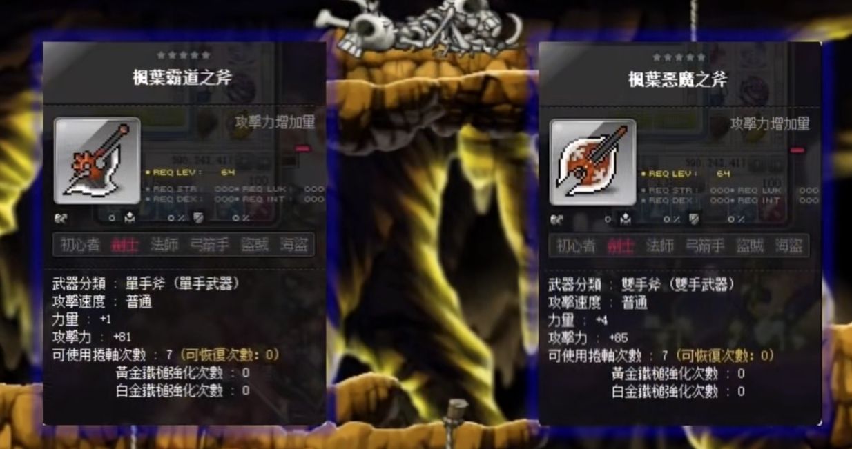 在这11种武器中,帽子是可以免费获得的,但这个帽子的等级比较低,是初始等级武器。而其他枫叶武器的等级就高得多,每把武器最开始就有43级,对应着游戏中的各个职业。这其中还有两把武器稀有度比较高,分别是旗帜和头盔,属性特别好,非常值得兑换。
