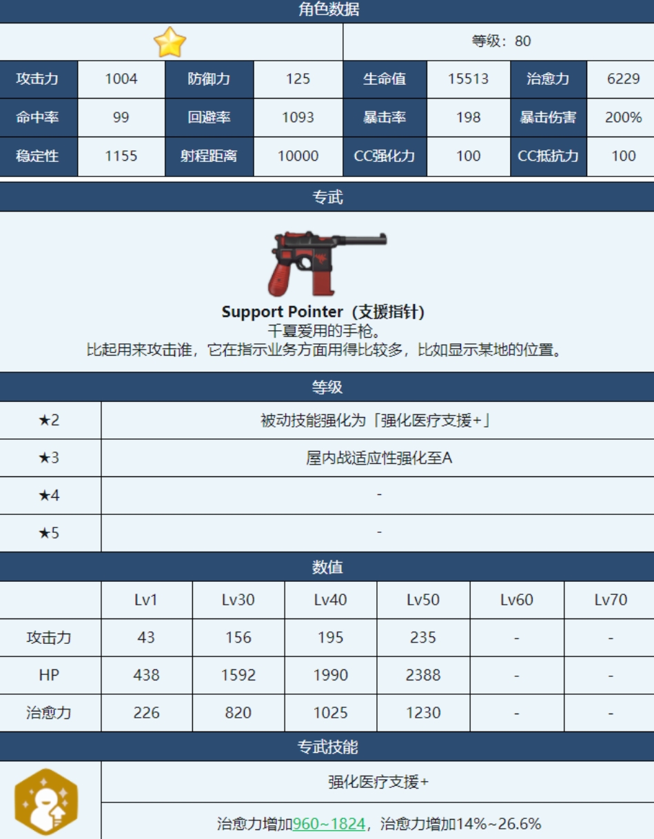 她的武器名字叫做支援指针,外观是一个十分小巧的手枪同时手柄也是红色的,千夏对于它也是十分喜爱的,它的作用是可以帮千夏增加医疗支援能力,这一点对于团队增益来说是非常关键的,同样也是比较适合屋内作战,屋外作战它的感应力则会下降。千夏的ex技能则是可以回复警方一名队友的195%~342%的治愈能力,同时还会额外帮这名队友解除身上的减益效果,正在被控制的输出型角色上面是非常不错的选择,她的普通技能几乎也都是可以为己方队友增加一定的速度和回血量,被动技能同样也是为己方队友增加血量,作为一名辅助性角色她是十分受欢迎的。