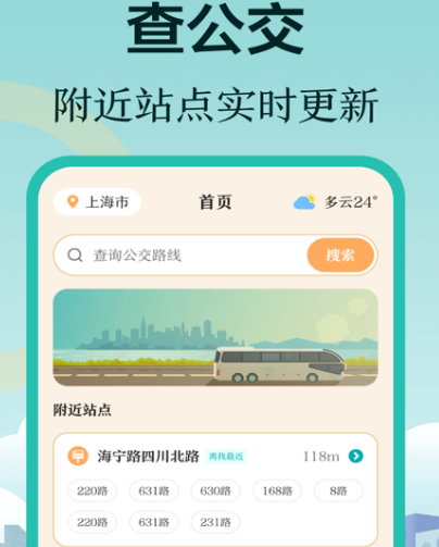 作为非常专业的软件,实时一键查询附近站点,该软件包含的城市众多,现在覆盖全国400多个城市,打开首页之后会发现有搜索框功能,只要搜索公交站点即可实施规划路线,另外还有附近站点及距离站点里程显示各种详细的内容,应有尽有,让小伙伴们出行无忧。打开软件首页,可看到天气预报,当前天气状况会实时更新,提前做好出行。