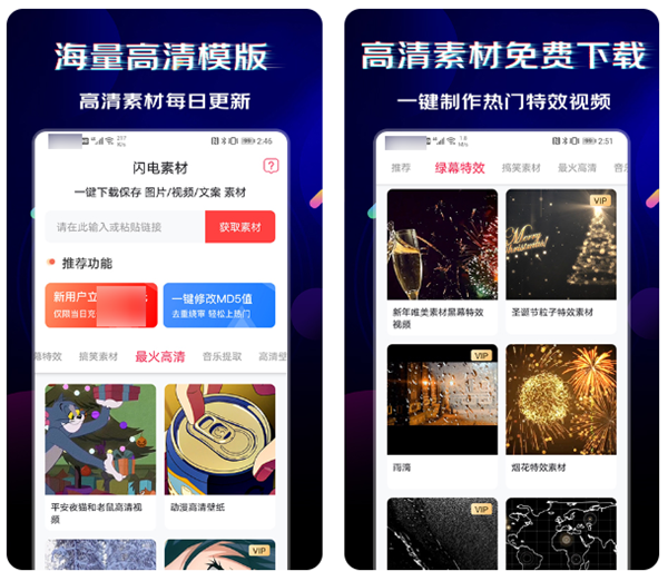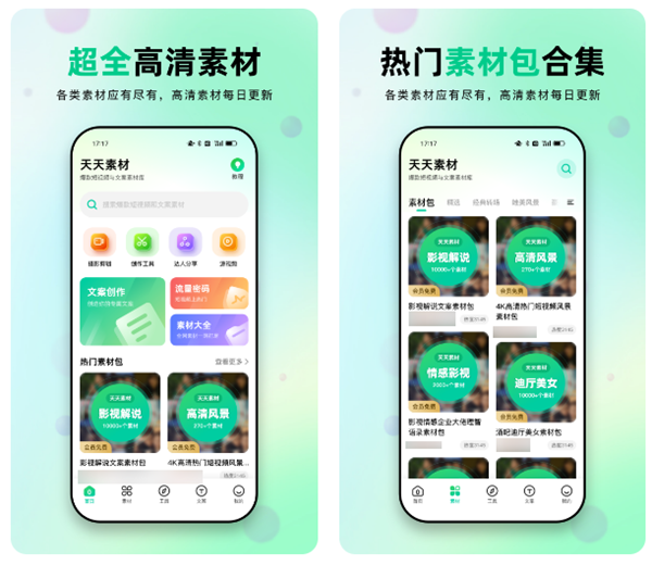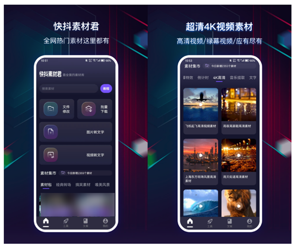 带有海量的超清素材可以免费使用,也是很多博主和UP主都在使用的素材软件。这里不仅带有大量的高清图片、酷炫视频特效和模板,而且还能够发现一些影视剧名场面、火爆的BGM音乐以及各种类型的文案。软件每天都会为我们发掘更新当下比较热门的素材,还带有众多强大的创作工具可以使用,感兴趣的话可以尝试下。