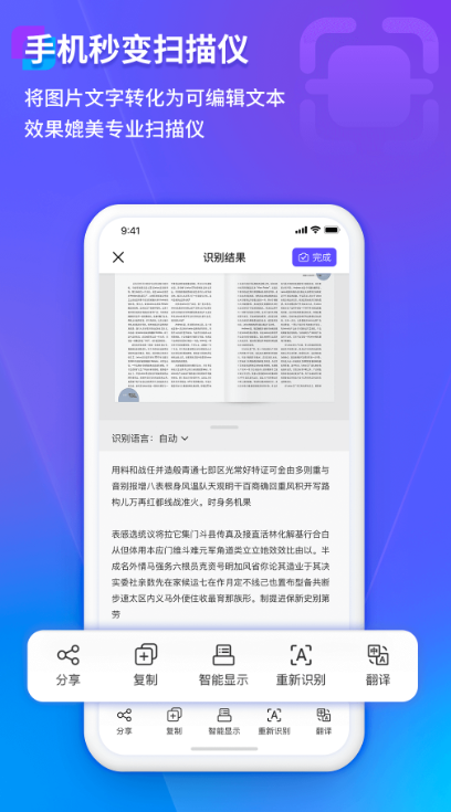 它支持对身份证、驾驶证等多种电子材料的文字提取。这款软件可以将手机中的文档转换成扫描件,并且对驾驶证、身份证等证件的扫描结果非常准确、完整。用户只需拿起手机拍照扫描,即可轻松实现文字提取和证件扫描。对于需要频繁处理文档和证件的用户来说,是一款不可或缺的实用工具。