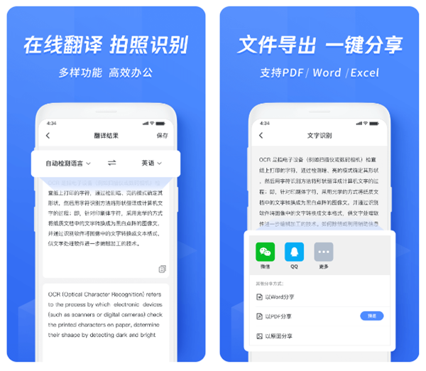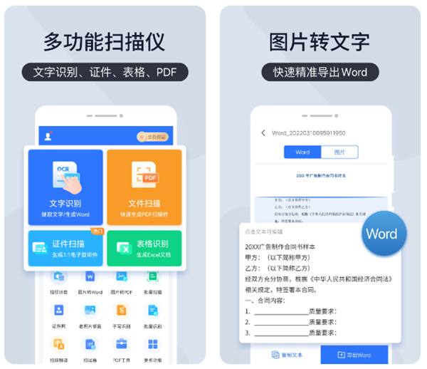 一款老牌的文字提取工具,不仅是可以通过导入图片,甚至还支持直接使用手机摄像头来完成扫描或者是拍照来进行识别。在识别修改之后可以自由选择转化为txt、doc或者是pdf等众多格式,还可以一键分享到其他软件中发送给小伙伴们。