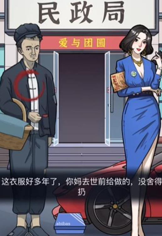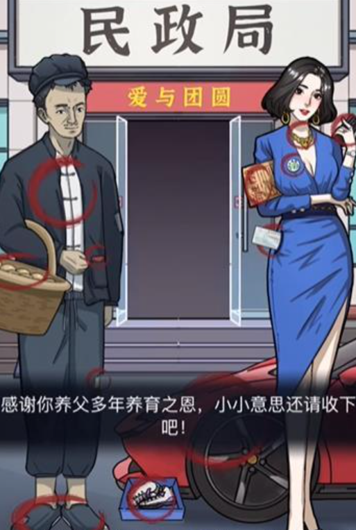 接下来需要点击主角的养父身上的三个物品:红色的红包、棉袄和篮子里的鸡蛋。这些物品暗示了他的贫穷和辛苦。