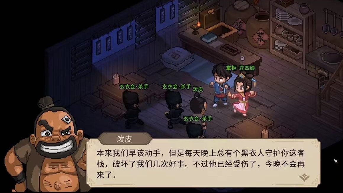交完10两银子后,玩家就能从店小二口中得知大梁城内的长乐柜坊便是玄衣会的总舵,玩家可与花四娘一起前往那里继续完成剩下的剧情。但要注意接下来会与玄衣会众人战斗,所以玩家最好将状态补好,并准备好补给品后再去开启任务,不然很容易就会失败。