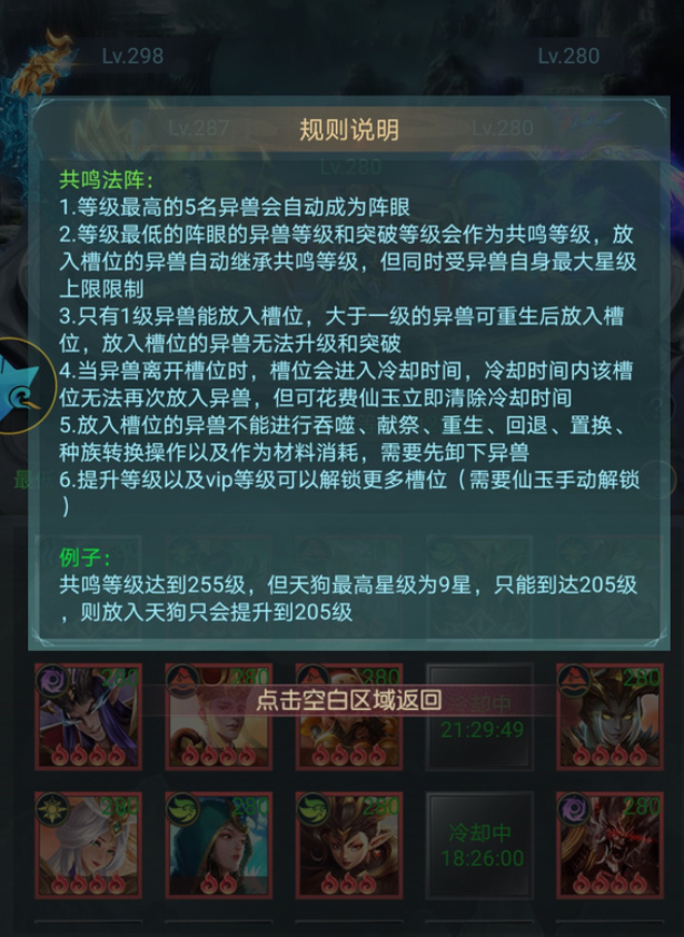 共鸣法阵是在玩家达到一定等级后开启的功能,开启地点在扶桑树。共鸣法阵的原理是,玩家可以选择五个最高等级的异兽作为阵眼,然后将其他的异兽放入法阵中,这些异兽的等级就会自动变成阵眼异兽中最低的那个。这样,玩家就不用花费仙玉和经验来升级这些异兽,而且这些异兽可以进行其他的培养,比如升星,开启兽魂,炼体,装备法宝等。但是,共鸣法阵中的异兽不能拿出来使用,如果拿出来,它们的等级就会恢复到一级,而且空出来的位置需要24小时的冷却时间,或者花费100仙玉直接冷却。