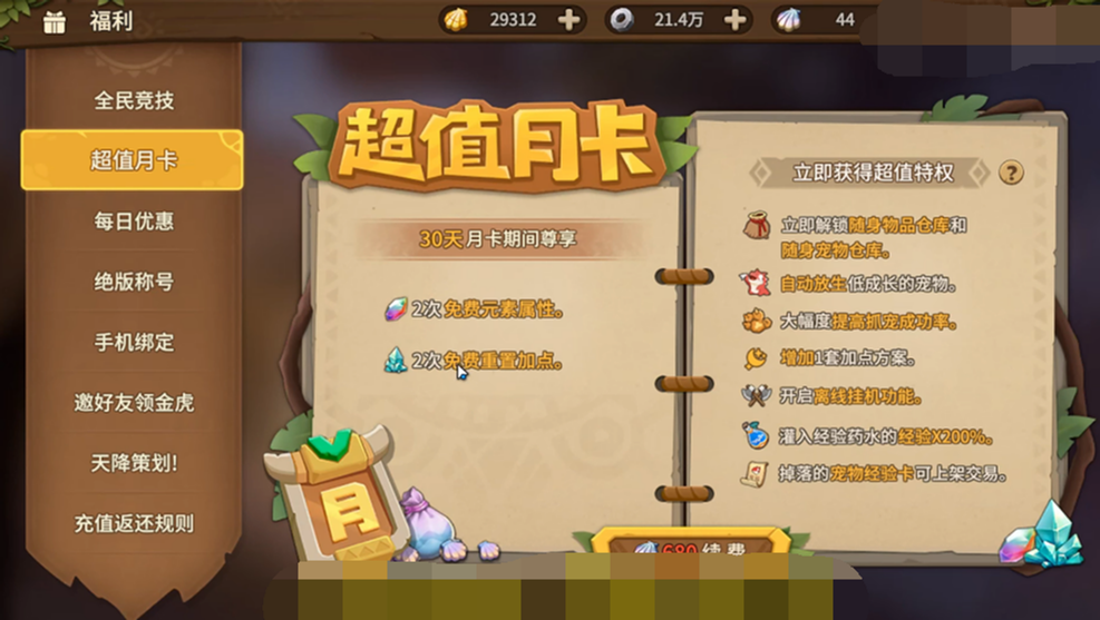 要是氪金就建议玩家们购买【超值月卡】,一个月就花68元,算起来每天是2元多,还是挺划算,尤其能实现上面提到的离线挂机,不过有更多的超值特权让玩家们使用,比如抓宠物的成功率提升了不少、用不到宠物经验卡是可以自由交易的、解锁随身仓库等,还有一些特权就不解读了,玩家可以在【福利】界面查看哦。
