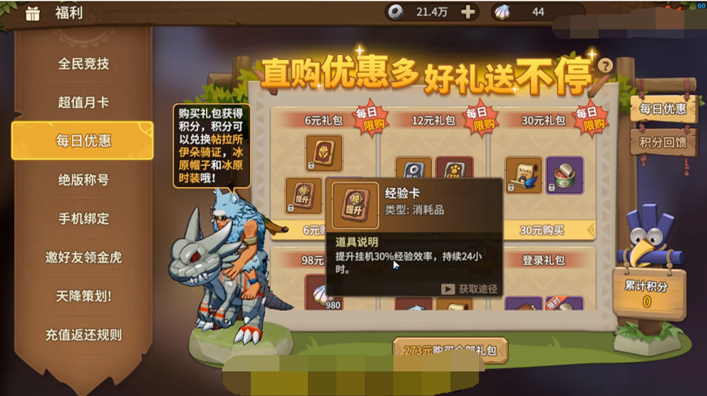 【每日优惠】有值得让玩家们购买的礼包,建议购买“6元礼包”,主要是两个不一样的经验卡,在使用后的24小时内用离线挂机获取经验的效率增加了30%,如果是双倍提升的更多,至少有60%,玩家每一天都能购买一次。