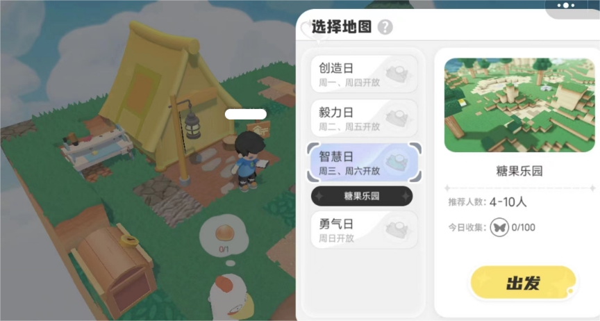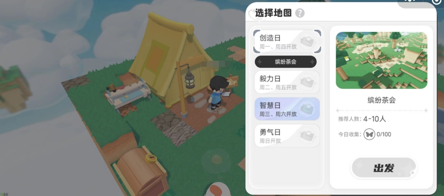 另外通过每个地图所对应的日子名称也能够得知其大致的玩法风格,比如缤纷茶会属于创造日开放的地图,所以它更多是需要你去进行创造事宜,而周二,周五的毅力日则需要你坚持某种操作,这对于玩家的操作会有较高的要求,不过探险本身的容错率也是很高的,挑战失败也没关系,直接退出去重新再来就可以,而且部分地图中是支持存档的,直接存档之后可以在地图内快速复活,接着继续挑战。