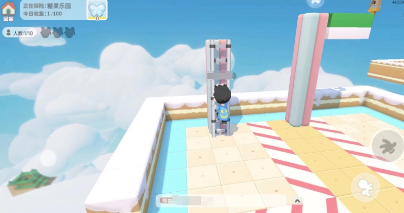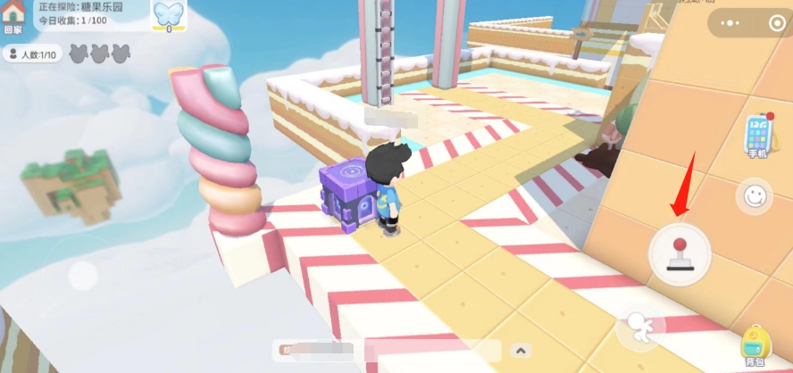 第一个技巧就是多观察地形,比如上图的这个糖果乐园,它很多的通路都在比较高的位置,那么这个时候就需要玩家利用某种方式登上去,而地图中的一些柱子建筑上正好贴着楼梯,那么这个时候操控自己的角色靠近,然后按住前进键你的角色即可登上高处,如果爬到一半发现上面的路不对,也无需原路返回,直接按右下角的小人图标快速跳下来即可。