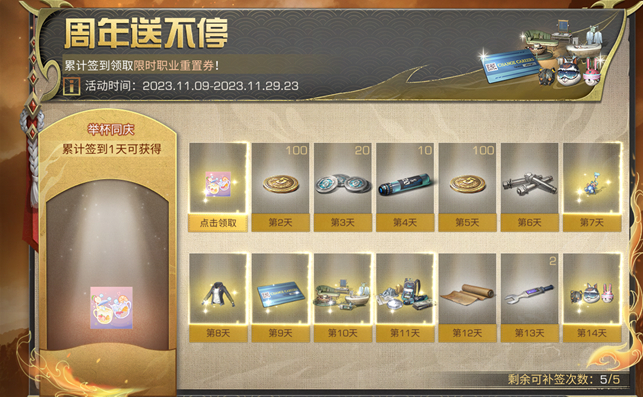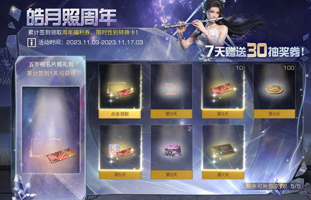 11月9号开始一直到11月17日的3点,正好是五六年庆典狂欢,累计活动签到之后,就可以获得丰厚的奖励,里面会有5岁了名片框,还会有周年庆福利券,又或者是限时的性别转换卡等等。周年签到还可以享受更多的福利,从11月9号开始一直到11月29日的晚上11点,幸运者只要在每天登录之后就可以得到对应的奖励。