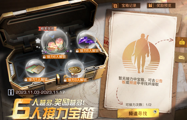 从11月3日开始到11月17日,玩家只要进入到频道去寻找宝箱,然后传递宝箱,就可以有机会获得奖励,主要的奖励就是配方残页,又或者是音乐香薰灯礼盒。