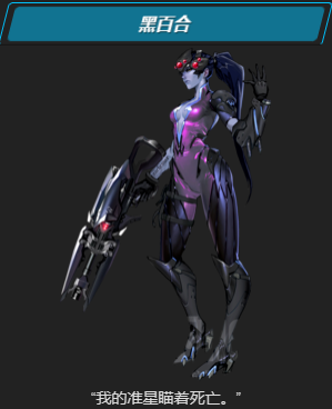黑百合武器是一把可以切换模式的狙击步枪,可以在近战时使用冲锋枪模式,也可以在远程时使用狙击模式。她的技能有两个,一个是抓钩,可以让她快速移动到高处或者逃离危险;另一个是毒刺,可以在地上放置一个小装置,当敌人触发时,会暴露敌人的位置,并造成一定的伤害。她的大招是红外视野,可以让她和队友看到所有敌人的位置,非常适合在进攻前使用,给队友提供情报和支援。黑百合的玩法是要利用她的抓钩找到一个安全的狙击点,然后用狙击模式射击敌人的头部,造成致命的伤害。她的毒刺可以用来防止敌人的偷袭,或者配合队友的攻击。她的红外视野可以让她和队友更好地掌握敌人的动向,发动突袭或者防守。