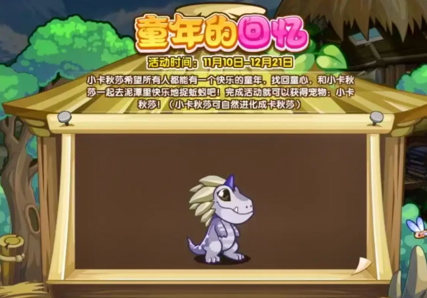 【童年的回忆】这是一个收集类任务,秋沙希望玩家们在游戏中都可以找回游戏的童心,玩家们在这个任务中需要和秋沙一起去抓蚯蚓,完成全部活动就可以免费获取到非常可爱的小宠物【小卡秋莎】了!