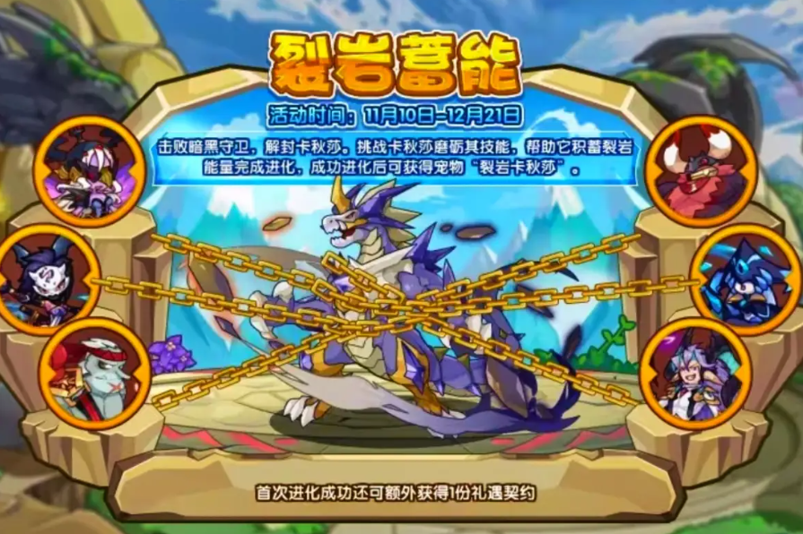 【裂岩蓄能】是一个收集活动,需要大家前往龙珠禁地去击败暗黑守卫,去解封卡秋莎,大家需要帮助卡秋莎积蓄裂岩能量,从而完成进化,就可以免费获得“裂岩卡秋莎”;其实官方目前没有放出其他的消息,这些消息都是最近要上线的一些活动,大家可以简单的进行了解!这个活动上线时间是11月10号,活动地图是【龙珠禁地】;