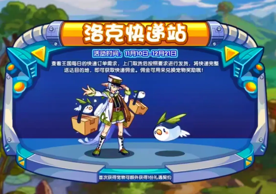 【洛克快递站】,这是游戏中新上线的一个趣味玩法,大家可以在游戏中活动大量的奖励,玩法也是比较简单的,大家需要在游戏中查看王国每天的一些快递订单的需求,同时还需要按照订单上的要求,前往地图坐标中进行上门取货,然后进行发货就可以了,不过奖励需要快递达到后才可以获取佣金哦,是不是非常的真实!这个活动完成后,获取到的佣金是可以去兑换宠物奖励的,本次的宠物奖励听说是非常可爱的【快递小鸽】;