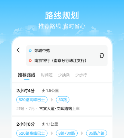 有很多经常乘坐公交车的人群,都会在手机上下载这一个软件,可提供极速公交查询的功能,比如想要了解一下自己所乘坐的公交到底什么时候能够到站,或者什么时候出站以及具体的公交车信息的话,都能够一键查询。如果在日常出行的时候,不知道如何对线路进行规划,该软件还提供这样的功能,可为每一个用户推荐适合的路线,既省时又省心。