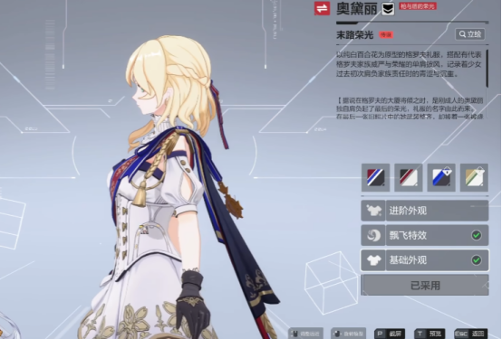 在红色的这款皮肤外形中就可以看得出来,当奥黛丽穿上这一款衣服时非常炫酷。这款皮肤叫末路荣光,真是皮肤如名字一样,上半身是一件礼服,下面搭配了一个长筒靴子,整体外观来看还是非常好的。当奥黛丽穿上这一身皮肤之后,显得整个人物非常高挺。