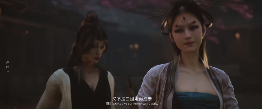 这段剧情主要讲述的是主角视角下被一群年轻漂亮的蜘蛛精领回府上,从她们的交谈中不难获悉,这群妖精领主角回来是为了办一场亲事的,不过成亲的对象却并不是她们这群小北,而是一位年龄更大些的存在。