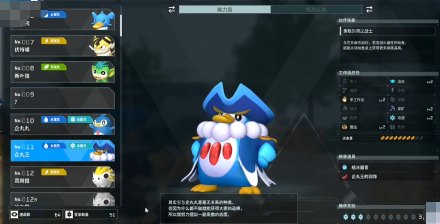 企丸王是一种水属性的幻兽,它的外形像是一个巨大的企鹅,它的身高是1.8米,体重是150公斤。企丸王的能力值也很高,它的生命值是300,攻击力是60,防御力是40,速度是30,智力是40。企丸王的技能有两个,一个是冰冻波,可以对敌人造成水属性的伤害,并有一定的几率冻结敌人、另一个是勇敢的海之战士,可以让企丸王在与火属性的幻兽战斗时,从敌人身上获得更多的掉落物。企丸王的掉落物有两种,一种是结冰器官,可以用来制作冰冻武器和装备;另一种是企丸王的羽饰,可以用来制作企丸王的服装和饰品。