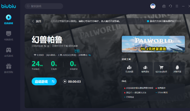 在满足这两个条件之后,就可以迅速的完成抓捕,如果在抓捕的过程中觉得有一些卡顿,可以选择到平台下载biubiu加速器, biubiu如今针对幻兽帕鲁游戏就有加速活动,新用户在注册之后马上就能够得到24小时加速时长,另外还可以搭配兑换码【biubiu001】,马上就可以额外得到三天的免费加速时长,总共是96小时免费加速时长。这一个兑换码没有限制性,无论是新用户还是老用户都可以使用。