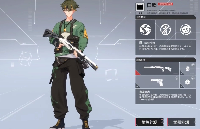 白墨:这是一个引发玩家热烈讨论的角色,因为很多玩家都是用过的,虽然有些玩家对他并不感冒,但不可否认的是,白墨能在战斗中发挥出令人瞩目的能力,当掌握在他熟练的玩家手中时,白墨就像一把锋利无比的死神镰刀,他手持霰弹枪,在近战交锋中几乎所向披靡,特别是在紧张的拉锯战中,他的优势尤为突出,此外白墨的高速移动、双连跳和滑翔技巧使他能够轻松接近敌人,并发动致命一击。