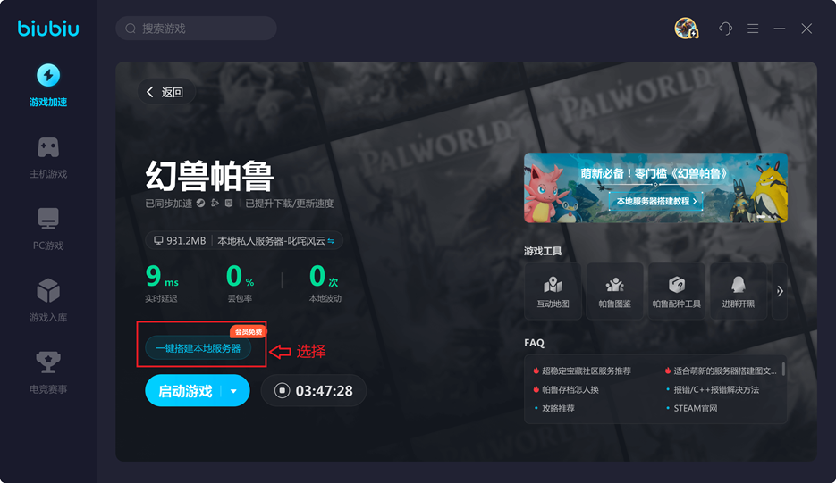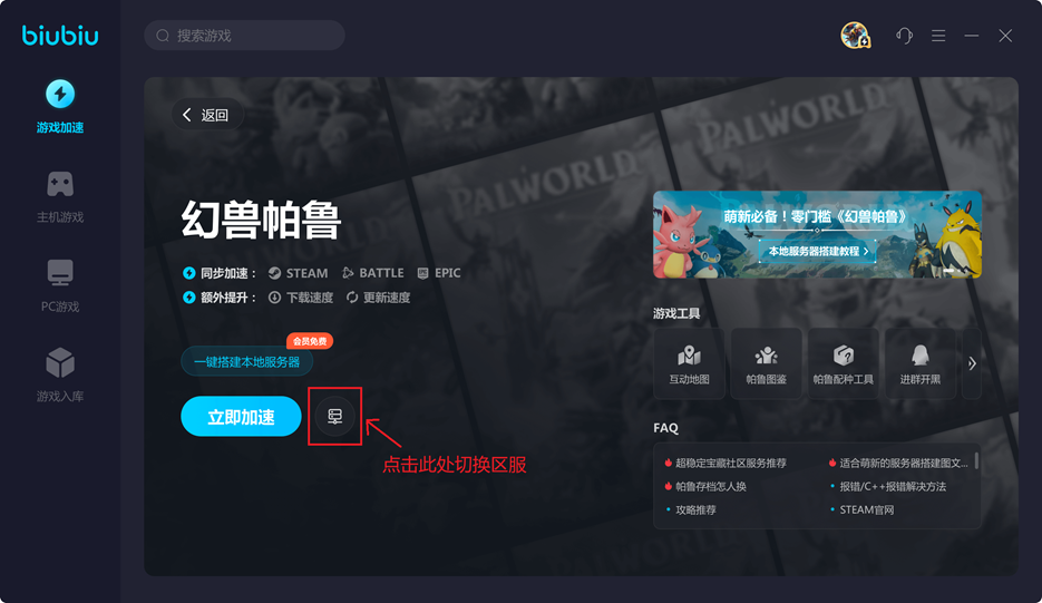 2、回到《幻兽帕鲁》游戏加速详情页,点击“一键搭建本地服务器”