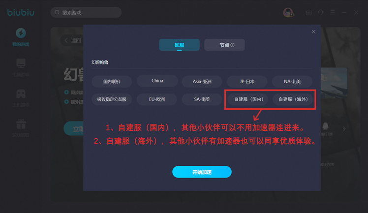 手动选择区服"自建服(国内)"或"自建服(海外)",点击“开始加速”;
