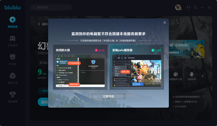 4、在保持本机关闭防火墙,同时安装并开启【Palworld DedicatedServer】的状态下,点击“立即开启”
