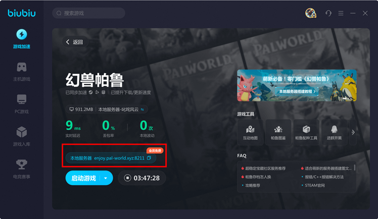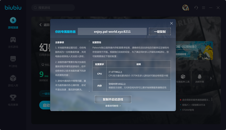 6、回到【幻兽帕鲁】加速详情页,此时biu仔会帮你记录下你的本地服务器(支持一键复制)