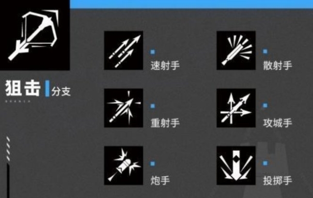 狙击职业则是可以分为速射、重射手、投掷手、散射手、攻城手、神射手、炮手这几个分支。速射是针对空中敌人进行射击的,在遇到此类关卡的时候比较有用处,而重射手则是可以在离敌人比较近的距离中使用高精准的射击伤害;投掷手是在攻击的同时可以对地面范围之内的敌人带来2次物理输出,相比第一次其实第二次的效果会稍微弱一点;散射手则是在输出的同时可以将范围放大,如果是针对前面横排的敌人则可以将输出提升到150%的数值。