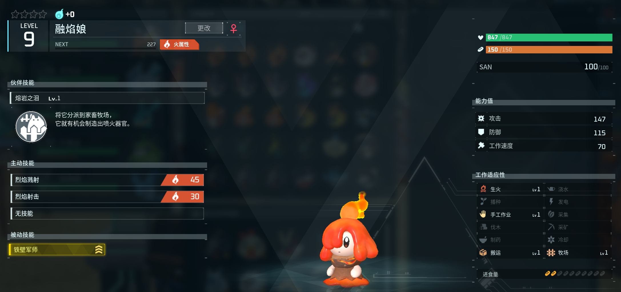融焰娘是一种非常稀有的帕鲁,它的官方特点解读是哭泣时会流下岩浆,而这些岩浆会被它的身体吸收,使它变得更强。但虽说解读这么牛,但是战斗除了针对冰、草基本没什么太大的用处,而且超低的工作能力也让她基本告别生产一线。但有个特性是超出同类帕鲁十条街,非常值得驯养。那就是伙伴技能是熔岩之泪,可以在家畜牧场制造出喷火器官,这是一种可以用来制作武器和工具的材料。它的掉落物品是喷火器官和优质帕鲁油,也是很有用的资源。