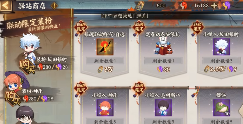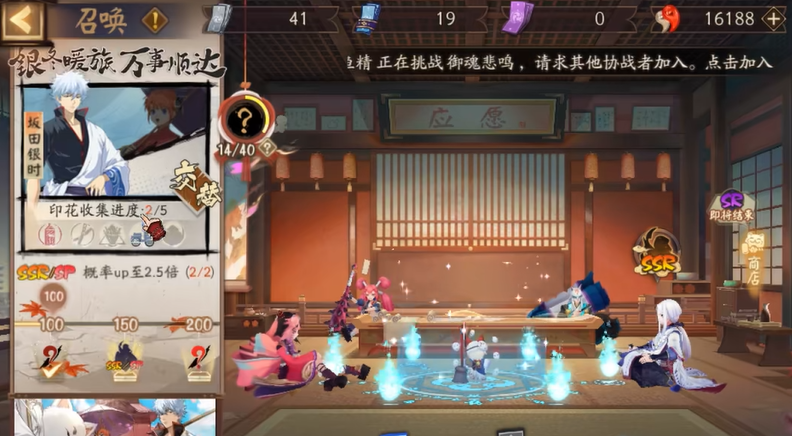 第二个活动是【银冬暖旅】本次活动属于一个限定返厂活动,玩家们可以在限定卡池中抽取到限定联动角色【坂田银时】【神乐】,而且这次活动大家需要注意的是最后一次限定返厂了!所以大家如果有多余的符咒,那么肯定是推荐玩家们去入手的,因为活动开启期间,玩家们可以选择这两个式神中的一个,作为愿望,许愿成功后,召唤出来的概率会大大的提升!而且在召唤期间,卡池中的其他式神抽中的概率也是提升到了2.5倍!同时,如果玩家们可以拥有这两个角色中的一个,那么可以通过手机5印花来进行召唤!如果拥有印花的话,多余的会直接转换成角色碎片用于升级!