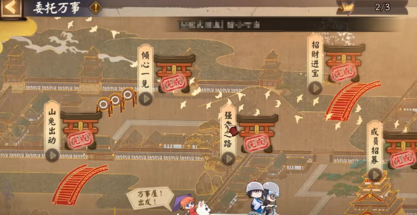 第三个活动【万事屋再临】本次活动的话,需要等级达到15级的阴阳师才可以参与的!这个活动也是比较简单的,大家可以理解成【委托】类的小游戏,在本次【委托万事】活动页面中,小伙伴们可以选择五个不同的场景来进行接取!获得的印花可以在商店中来兑换纸人!