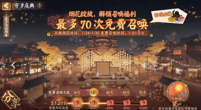 第五个活动【守岁庆典】,在活动期间,参加花合战,积攒60花札经验,就可获得烟花,在活动中点燃后,可以拿到随机的奖励,同时增加全服的活动进度;全服进度提升后,可解锁式神祝福以及活动二阶段的免费召唤福利;