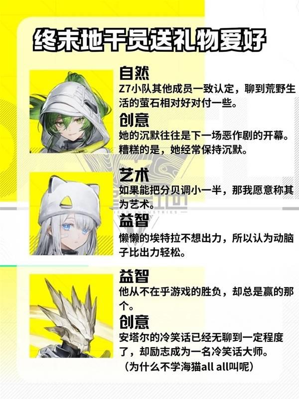 《明日方舟终末地》里,每个干员都有自己偏爱的礼物,选对了礼物,能大大提升他们的信赖度。接下来,让我给大家简单总结一下每位干员喜欢的礼物类型,希望能对大家有帮助。