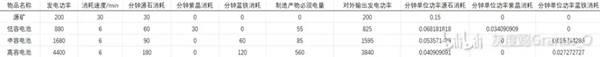 发电功率/消耗速度/分钟源石/紫晶/蓝铁消耗:游戏内配方及发电功率数据,换算以分钟为单位后填入即可。
