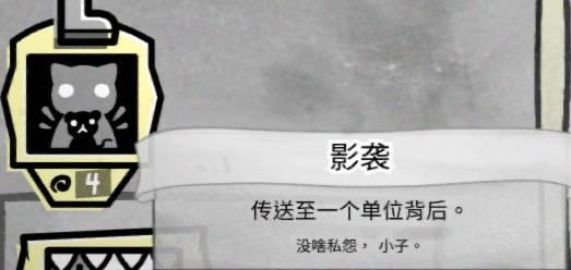 经过我们的精打细算,我们成功的在回合结束时具有1点护盾,与此同时我们还获得了【换皮伪装】,这让我们可以不受攻击的在敌人之中穿行,对于单猫而言确实是神技了。