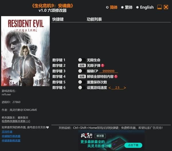 玩《生化危机9》时,想要降低游戏难度,可以用修改器来实现无限生命值和无限子弹等效果。下面是“风灵月影”提供的《生化危机9》修改器下载分享,希望能帮到大家。