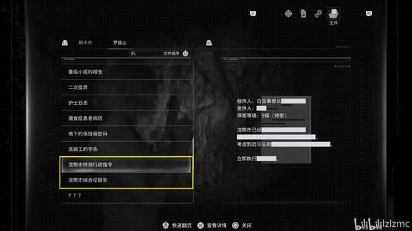 剧情,格蕾丝打开菜单,在里昂剧情后自动获得两个文件:【文件35:浣熊市特别行动指令】、【文件36:浣熊市综合征报告】。