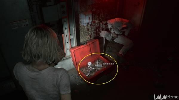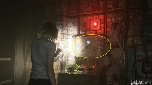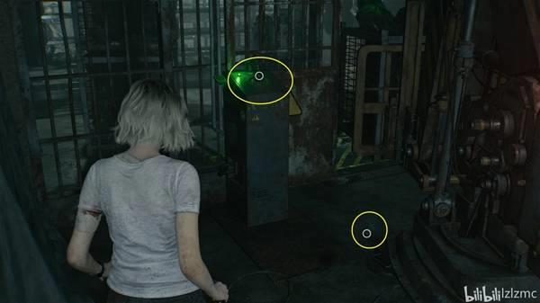 锅炉房西侧,工具箱里获得关键物品:四角套筒扳手和1个空瓶。原路返回铁丝网入口时,遇到玛莉堵路,绕一下就能出去,接着去锅炉房下方的配电器。