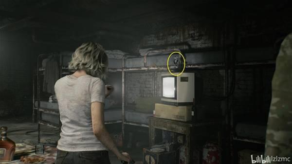 锅炉房下方的配电器,插入接合插头,南部休憩室开门,进去爆头两个有头的丧尸,然后电视机上,使用手枪打掉黑白浣熊先生7。