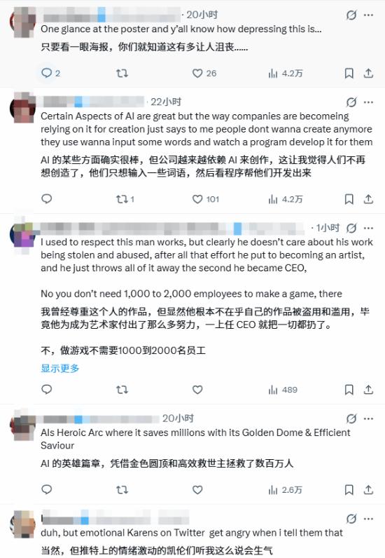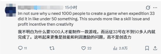 该言论发布后,多位玩家在社交平台表达了不同观点:有玩家指出,《远征 33 号》等游戏仅需不到 50 人即可完成开发,认为这一现象更倾向于 “技能与利润激励问题,而非创造力不足”;也有玩家认为 AI 虽有优势,但企业过度依赖 AI 创作,反映出 “人们不再想主动创造,仅希望通过输入指令让程序完成开发”;还有玩家表示,曾认可金亨泰作为创作者的作品,但如今其作为 CEO 的言论,体现出对作品原创性的忽视,同时质疑 “开发游戏无需 1000-2000 人的规模”。