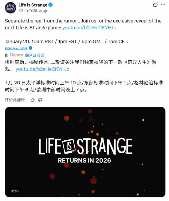 星空曾报道,克洛伊角色将回归于《奇异人生》系列新作。今天官方终于揭开了神秘面纱,确认新作的消息,并透露将在北京时间1月21日凌晨2点发布更多细节。