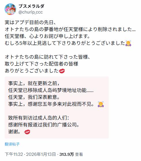 最近,X平台上的用户@churip_ccc发消息说,他在《集合啦!动物森友会》里打造的著名梦境“成人岛”已被任天堂在更新前移除。