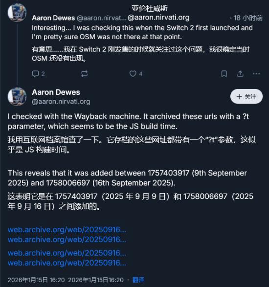 不久之后,另一位网友@aaron.nirvati.org补充表示,他在Switch 2刚刚官宣的时候就关注过这个网站,并且他确信当时还没有这串OSM字符。随后,他使用Wayback Machine检查了该网站的历史存档,根据时间戳来看,这一字符可能是在2025年9月到2025年9月16日之间加入的。